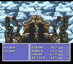 Attack the left crane first, use Edgar's Drill, Sabin's Aurabolt,